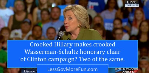 History, Politics, Uncategorized HILLARY AND WASSERMAN-SCHULTZ TEAM UP AGAIN Image July 25, 2016 A. L. Luttrell 3 Comments After resigning as chairwoman of the DNC for rigging the primaries in Hillary’s favor (to save some face rather than be fired), Little Debbie Wasserman-Schultz was rewarded by Crooked Hillary for a job well done! Share this: Share on X (Opens in new window) X Share on Facebook (Opens in new window) Facebook